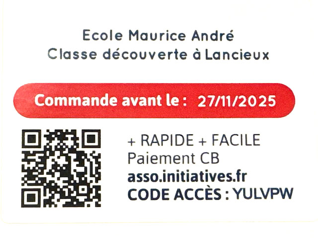 L’école élémentaire Maurcie André vous propose la vente de chocolats français, sans frais de port, afin de les aider à financer leur classe découverte prévue à Lancieux du 30 mars au 03 avril. Le QR code vous permettra l’accès au catalogue. Mentionnez vos nom et prénom ajoutez mairie ou FR pour les adhérents du Foyer rural. Les commandes doivent être […]