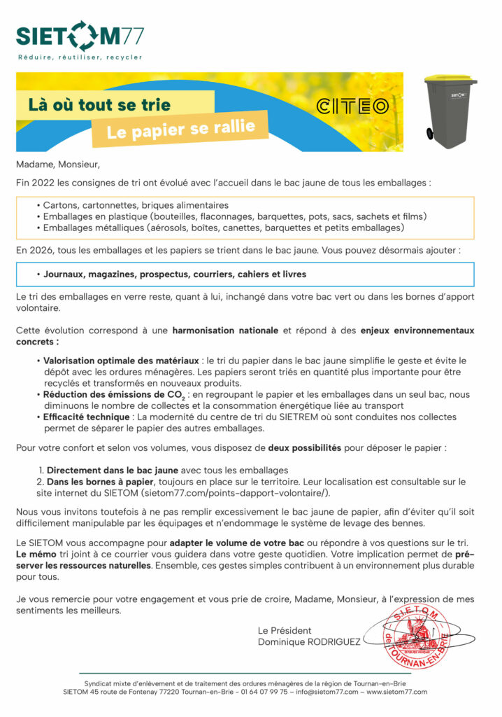 Information Les papiers vont aussi dans le bac jaune 12 mars, 2026 Webmaster Commentaires fermés sur Les papiers vont aussi dans le bac jaune En 2026, tous les emballages et les papiers vont dans le bac jaune. Vous pouvez désormais ajouter les journaux, magazines, prospectus, cahiers et livres Navigation de l’article Précédent